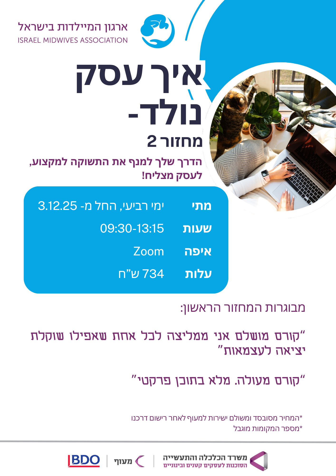 קהל יעד: הקורס מיועד למיילדות בעלות רעיון עיסקי או בעלות עסק בתחילת דרכן שרוצות לפתח פעילות עסקית, גם בשילוב עבודתן כשכירות.
